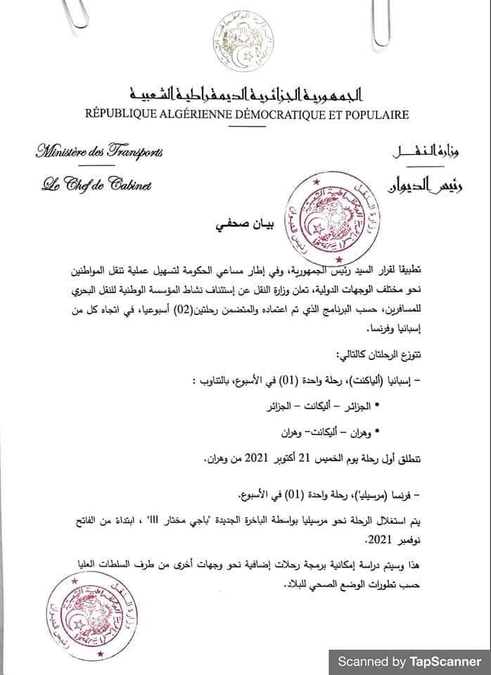 ووسط ٱجراءات و شروط ٱحترازية برمجت الشركة الوطنية للمسافرين بداية من 21 أكتوبر المقبل أول رحلاتها وسط فرحة كبيرة للمسافرين الذي عبروا على وسائط التواصل الإجتماعي على فرحتهم بعودة الرحلات البحرية.