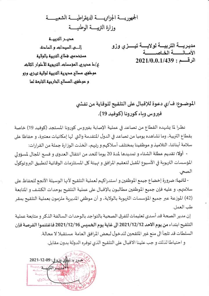 نظرا لما يشهده قطاع التربية من تزايد وتيرة الإصابات بفيروس كورونا، أصدرت مديرية التربية لولاية تيزي وزو بيان تدعوا فيه، كل منتسبي القطاع للإقبال على عملية التلقيح للوقاية من فيروس كورونا.