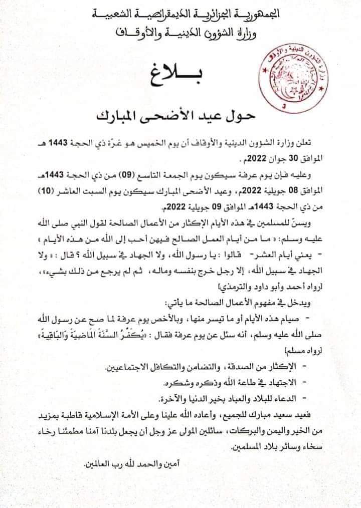 وأضاف بيان الوزارة أن يوم عرفة التاسع من ذي الحجة سيوافق يوم الجمعة الثامن جويلية، وسيحيي الجزائريون على غرار دول عربية وإسلامية عيد الأضحى المبارك يوم السبت الموافق للتاسع جويلية 2022
