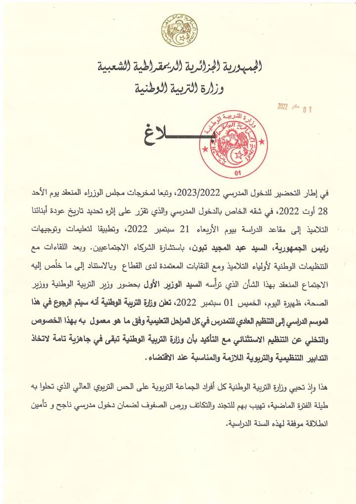 عودة نظام التمدرس العادي في كل المراحل التعليمية للموسم الدراسي 2022/2023 جاء بعد تشاور جمع الوزير الاول بوزير التربية الوطنية و بإستشارة الشركاء الاجتماعبين.