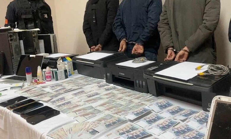 وبعد تكثيف التحريات تم توقيف 03 أشخاص آخرين ثبت ضلوعهم في ذات القضية، وأسفرت عمليات التفتيش التي تمت بموجب إذن صادر عن النيابة عن حجز 03 حواسيب محمولة، 06 طابعات ملونة مزودة بناسخ وماسح ضوئي، عبوات وخراطيش حبر، أوراق بيضاء رفيعة الجودة، دعامات الكترونية وأقراص صلبة خارجية ومرنة، آلة قطع الورق، مطاط يستعمل لمسك رزم الأوراق النقدية المزورة.