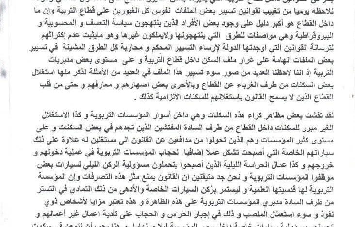 البيان الصادر بتاريخ 12 أوت 2025 أشار إلى سوء تسيير وفساد في ملف السكنات الوظيفية، حيث تم تسجيل استغلال غير قانوني، تأجير خفي، وتحويل بعضها لأنشطة تجارية أو مرائب لسيارات خاصة، مع تغاضي بعض المسؤولين.