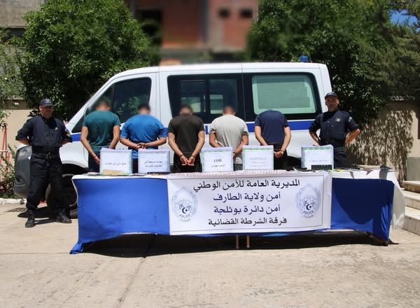 وقد تم تقديم الموقوفين أمام وكيل الجمهورية لدى محكمة الطارف، لمتابعتهم بتهم حيازة وتخزين المؤثرات العقلية بطريقة غير شرعية لغرض البيع في إطار جماعة إجرامية منظمة، وحيازة أسلحة بيضاء محظورة من الصنف السادس دون مبرر شرعي، وحيازة وصيد المرجان الأحمر الخام دون سند قانوني بغرض البيع.