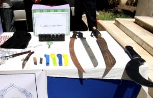 مجموعة من الأسلحة البيضاء المحظورة من الصنف السادس (سيوف، سكاكين كبيرة الحجم، جناجر) وقناع وجه.