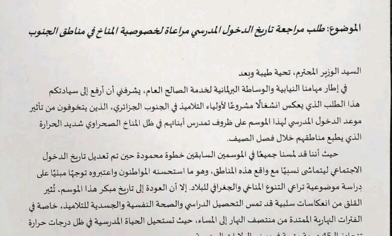 وجاء في نص المراسلة أن الدخول المدرسي المبكر في ظل درجات حرارة تتجاوز 45 درجة مئوية، يؤثر سلبًا على صحة ونفسية التلاميذ، ويعرقل سير العملية التربوية، لا سيما وأن فترات الدراسة تمتد في بعض المناطق إلى غاية منتصف النهار.