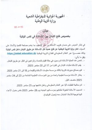 في خطوة تهدف إلى تحسين ظروف العمل وتقريب الأساتذة من مقرات إقامتهم، أعلنت وزارة التربية الوطنية عن فتح عملية نقل الأساتذة عن طريق التبادل داخل نفس الولاية، وذلك حصريًا عبر النظام المعلوماتي لقطاع التربية الوطنية على الموقع الرسمي: ostad.education.dz.