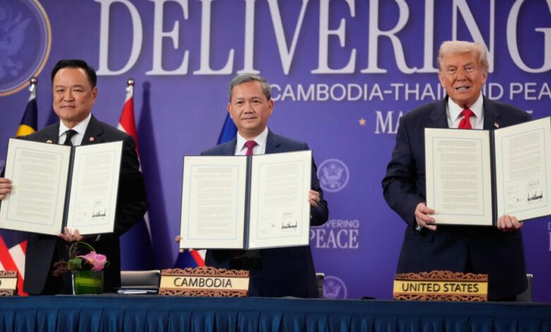 شهدت العاصمة الماليزية كوالالمبور، الأحد، توقيع اتفاق وقف إطلاق نار بين تايلاند وكمبوديا، بحضور الرئيس الأمريكي دونالد ترامب، الذي وصف الاتفاق بأنه “قد ينقذ ملايين الأرواح”، في خطوة أنهت أشهرًا من التوترات الدامية على الحدود بين البلدين.