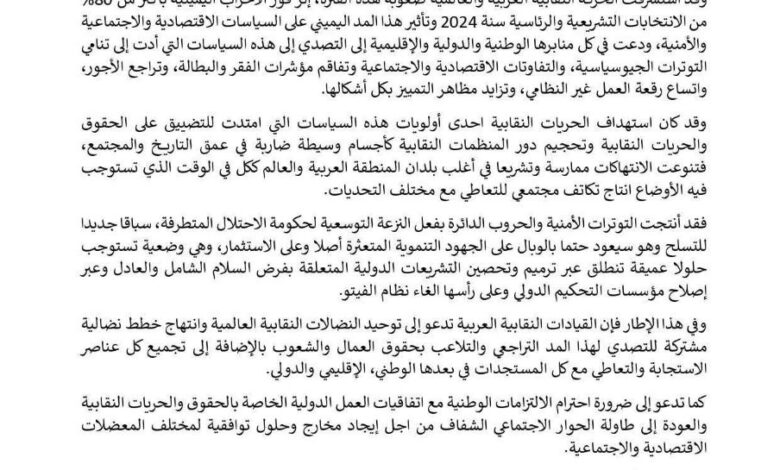 وأكد البيان أن الحركة النقابية العربية والعالمية تمرّ بمرحلة دقيقة، نتيجة تغوّل السياسات الاقتصادية النيوليبرالية وتراجع الحريات وتزايد البطالة والفقر، داعياً إلى توحيد النضالات النقابية عربياً ودولياً لمواجهة هذه التحديات، والدفاع عن كرامة العمال وحقهم في العمل اللائق.