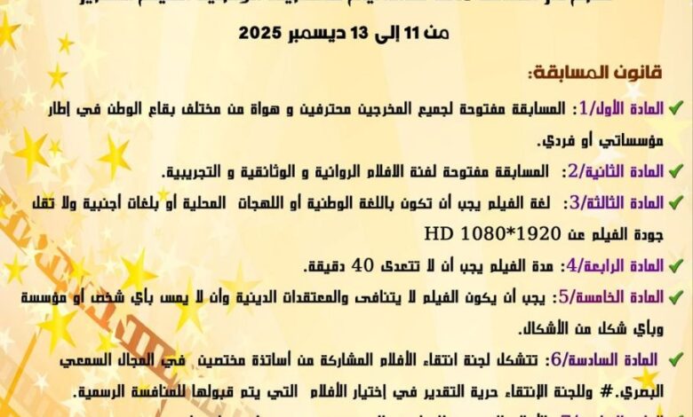 تحديد 3 ديسمبر 2025 كآخر موعد لاستقبال الأفلام وإعلان القائمة الرسمية يوم 5 ديسمبر 2025 تمهيدا لإطلاق دورة تنتظر أن تضيف لمسة جديدة للمشهد السينمائي الوطني.
