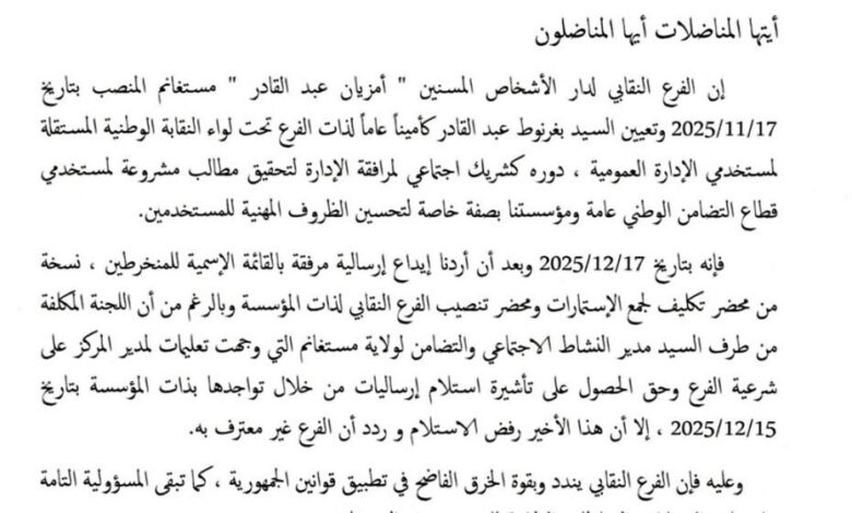 وشدد الفرع النقابي على تمسكه بمواصلة أداء مهامه والدفاع عن حقوق المستخدمين وتحسين ظروفهم المهنية والاجتماعية، مؤكدًا أن أي تضييق على النشاط النقابي لن يزيد إلا في تعميق الاحتقان داخل المؤسسات.