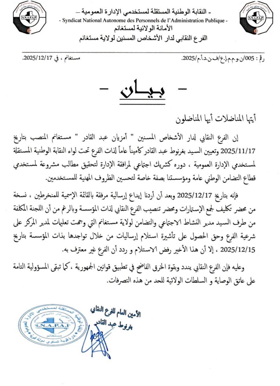 مستغانم – ندّد الفرع النقابي لدار الأشخاص المسنين بولاية مستغانم، التابع للنقابة الوطنية المستقلة لمستخدمي الإدارة العمومية (السناباب – SNAPAP)، بما وصفه بالمساس بحقوق العمل النقابي وعرقلة نشاطه القانوني داخل المؤسسة.