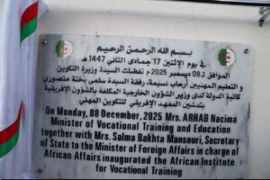 أشرفت وزيرة التكوين والتعليم المهنيين، السيدة نسيمة أرحاب، صباح اليوم الاثنين 08 ديسمبر 2025، على تدشين المعهد الإفريقي للتكوين المهني بحي الساحل بولاية بومرداس، وذلك بحضور السيدة سلمى بختة منصوري، كاتبة الدولة لدى وزير الشؤون الخارجية المكلّفة بالشؤون الإفريقية، ومفوض شؤون التعليم و العلوم و التكنولوجيا و الابتكار في مفوضية الاتحاد الافريقي السيد Gaspard Banyankimbona ، إضافة إلى السيدة فوزية نعامة، والي ولاية بومرداس.