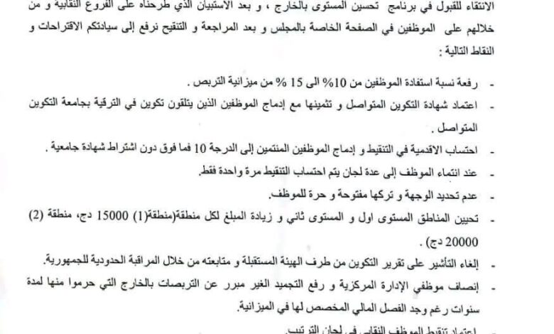 وأضاف المصدر ذاته أن المجلس اقترح كذلك اعتماد تنقيط الموظف النقابي ضمن لجان الترتيب، وإلغاء شرط اللغة الأجنبية في التنقيط، إلى جانب إدماج أعوان الخدمات والمناصب النوعية ضمن برامج التكوين.