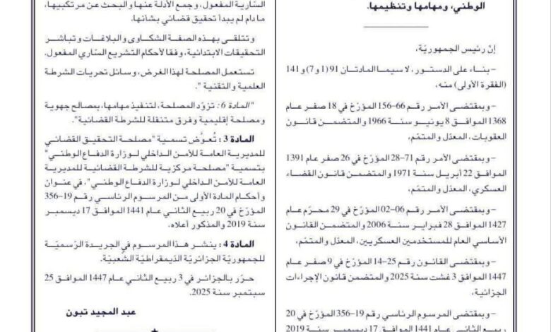 في خطوة تنظيمية تعكس الإرادة السياسية في تعزيز الفعالية المؤسساتية، صدر في العدد 66 من الجريدة الرسمية للجمهورية الجزائرية مرسومان رئاسيان جديدان يهدفان إلى إعادة تنظيم المديرية العامة للأمن الداخلي والدفاع الوطني.